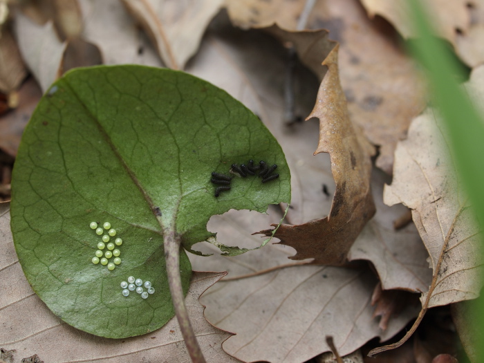 成長が止まった古葉の卵が,産卵時のままの間隔で孵化を迎えるのに対して,新葉はぐんぐん成長して卵と卵の間隔が広がっていく。